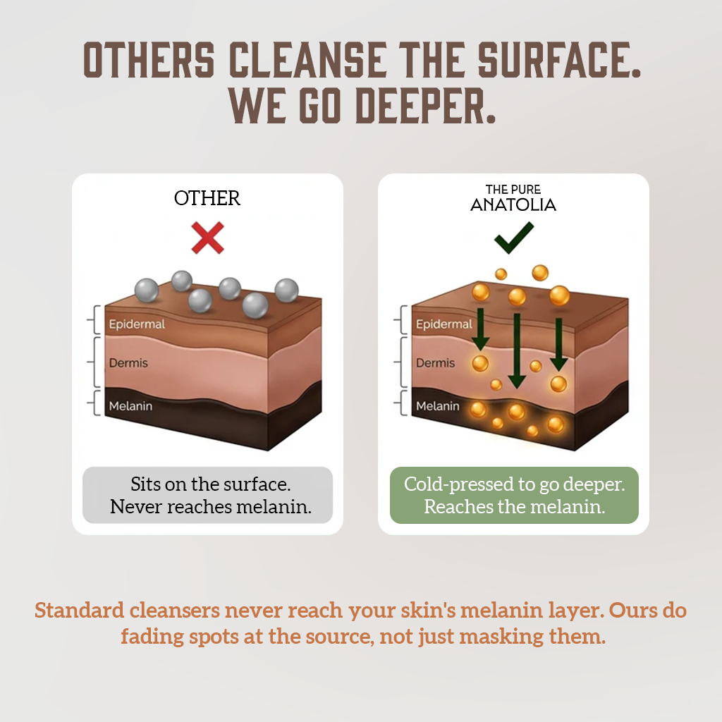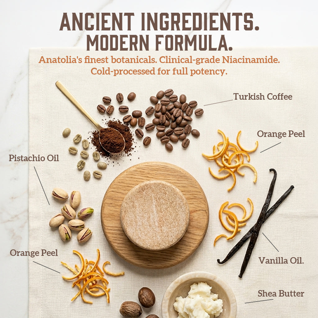 Most cleansers clean the surface and nothing more. The Pure Anatolia Cleansing Bar combines physical exfoliation from Turkish Coffee with clinical-grade Niacinamide to actively target dark spots and uneven tone while you cleanse — two steps in one, without the extra products.